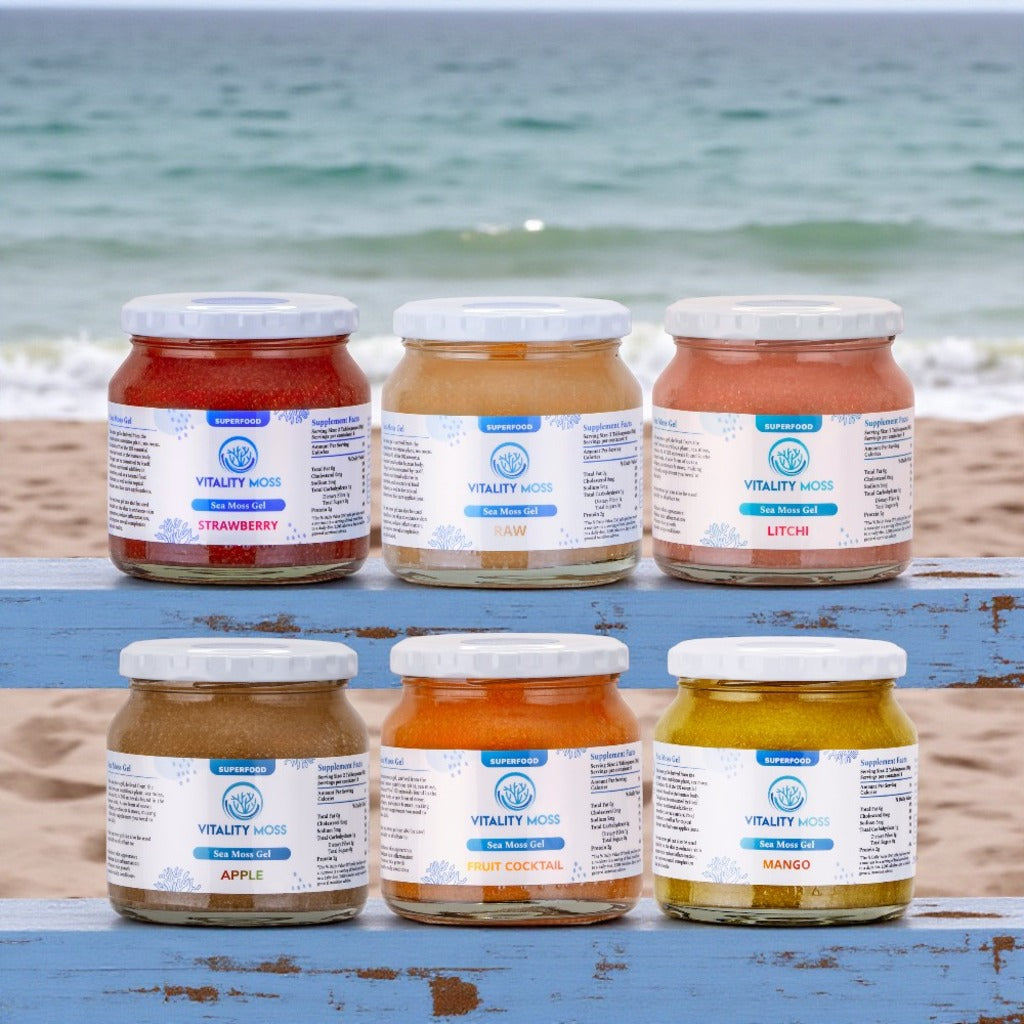 Our sea moss gels are a nutrient-packed addition to your wellness routine, offering 92 of the 102 essential vitamins and minerals and 18 of the 20 amino acids your body needs. Available in strawberry, raw, litchi, apple, fruit cocktail and mango flavours, it's both delicious and beneficial.