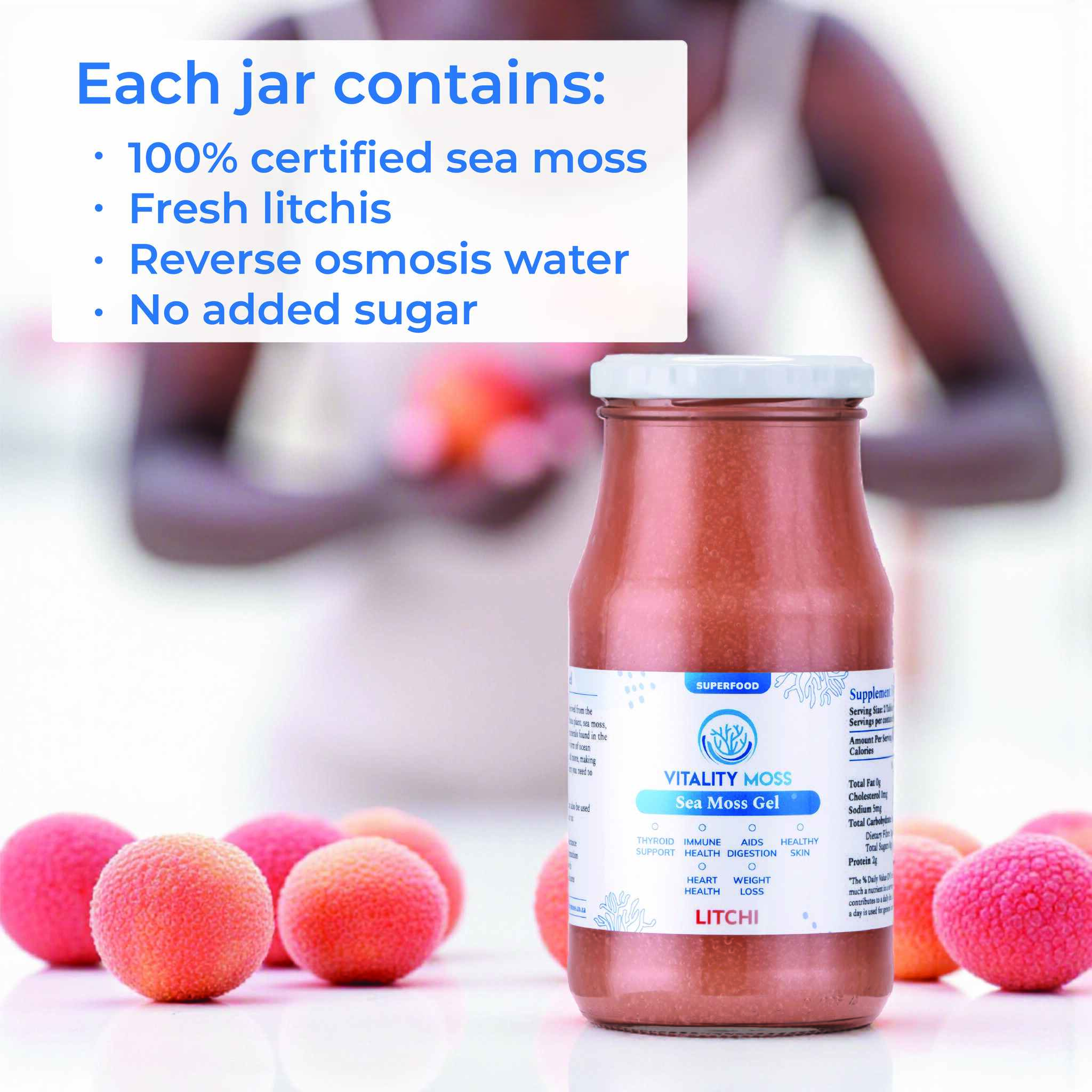Experience a delicate fusion of flavour and benefits with our refreshing Litchi Sea Moss Gel. Crafted by merging the nourishing properties of sea moss (the ocean’s most nutritious plant) with the naturally sweet, floral notes of real litchi. Our delicious gel is packed with essential vitamins, minerals, and antioxidants while offering a unique way to support your well-being — with absolutely no added sugar.