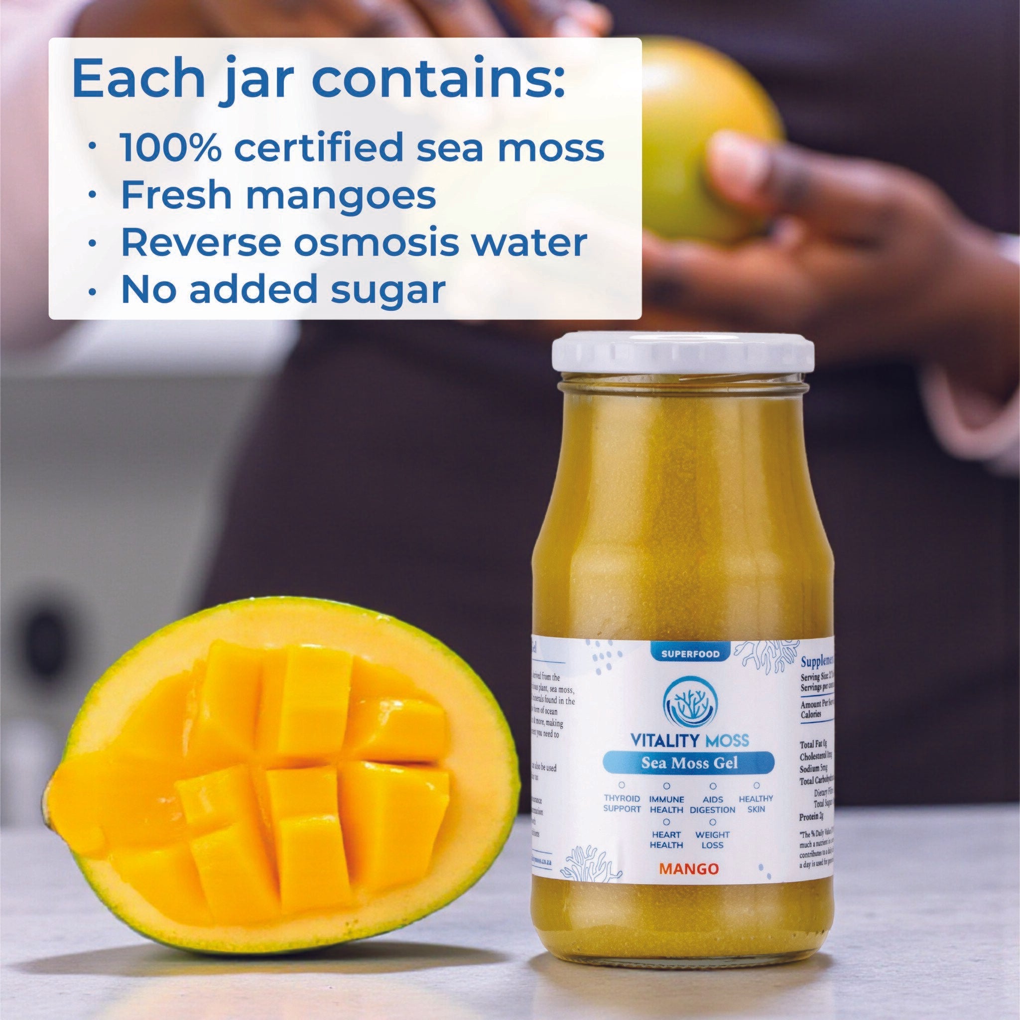 Immerse yourself in its velvety texture and awaken your senses. Our sea moss gel can be added to smoothies, tea/coffee, porridge, and yoghurt, or you can simply enjoy the benefits by consuming it by itself one scoop at a time. Our sea moss gel can also be used topically as a face or skin mask to promote clear and radiant skin. Let the essence of fresh mangoes and the ocean's bounty come together to create a symphony of flavour and vitality. Available in both 250ml and 500ml so that you have options throughout your wellness journey.