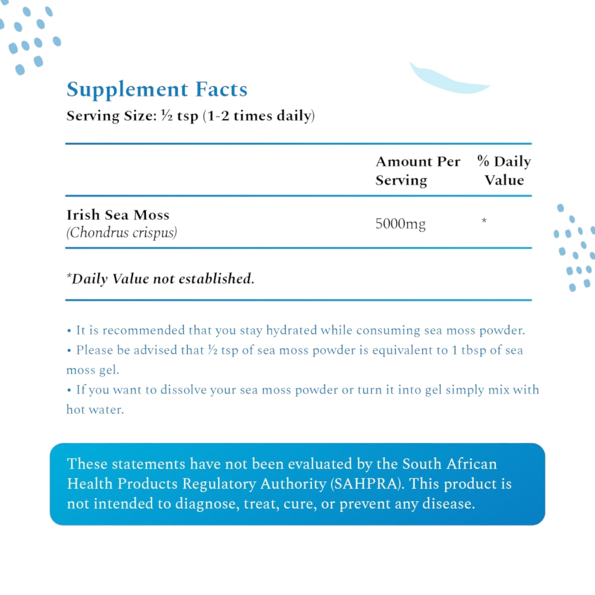 As a dietary supplement, take 1/2 tsp of sea moss powder 1-2 times daily with any drink or meal.